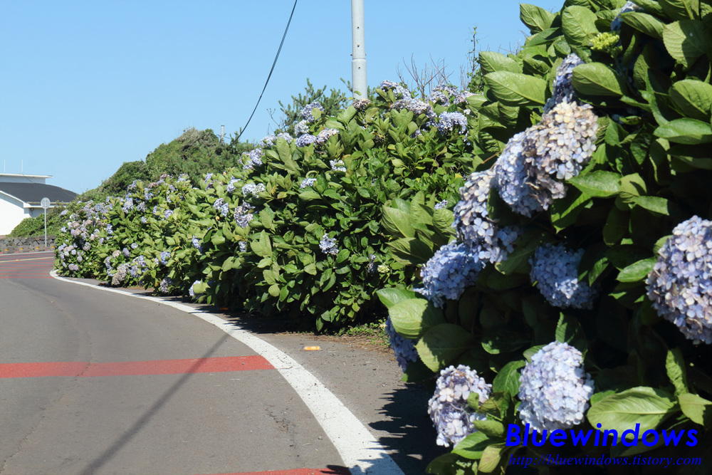 하도리 해수욕장에서 성산 쪽을 가는 해안도로를 따라 양쪽으로 수국이 만개해 있습니다.
