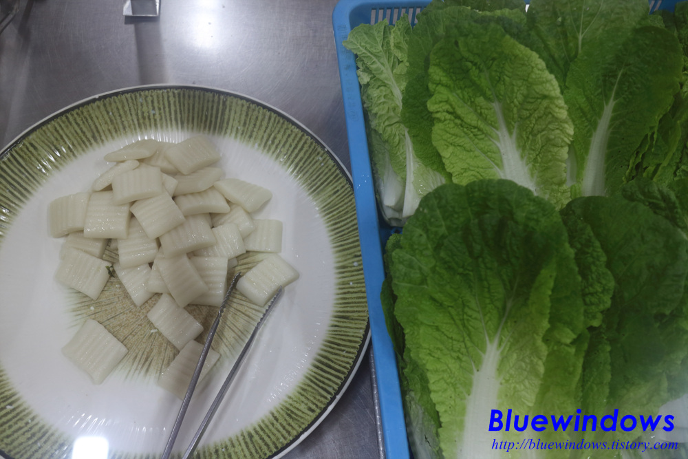 메뉴는 돼지불백, 떡복이, 잡채, 수육, 삼채소 기본 밑반찬 외에 이집은 돈까스, 양배추 셀러드도 제공됩니다.