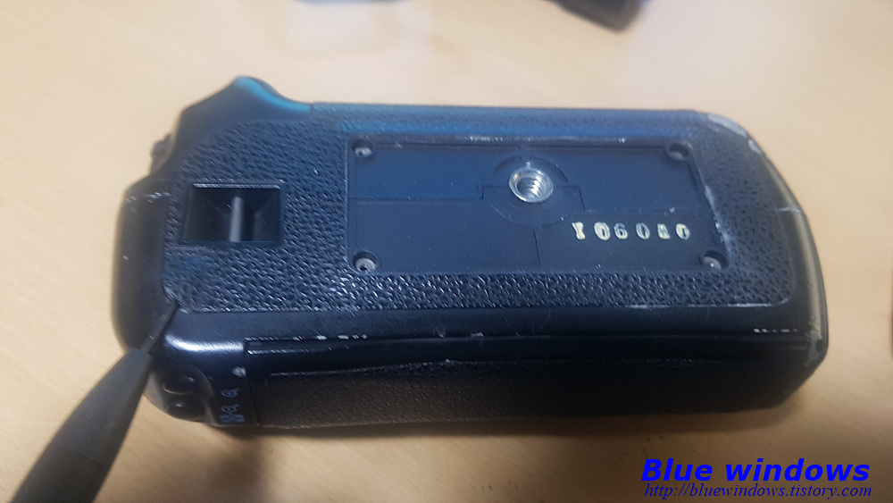 캐논 마크가 있는 철판 위에 있는 여러 개의 볼트와 세로그립 부분 쪽에 있는 4개의 볼트를 풀어 줍니다.