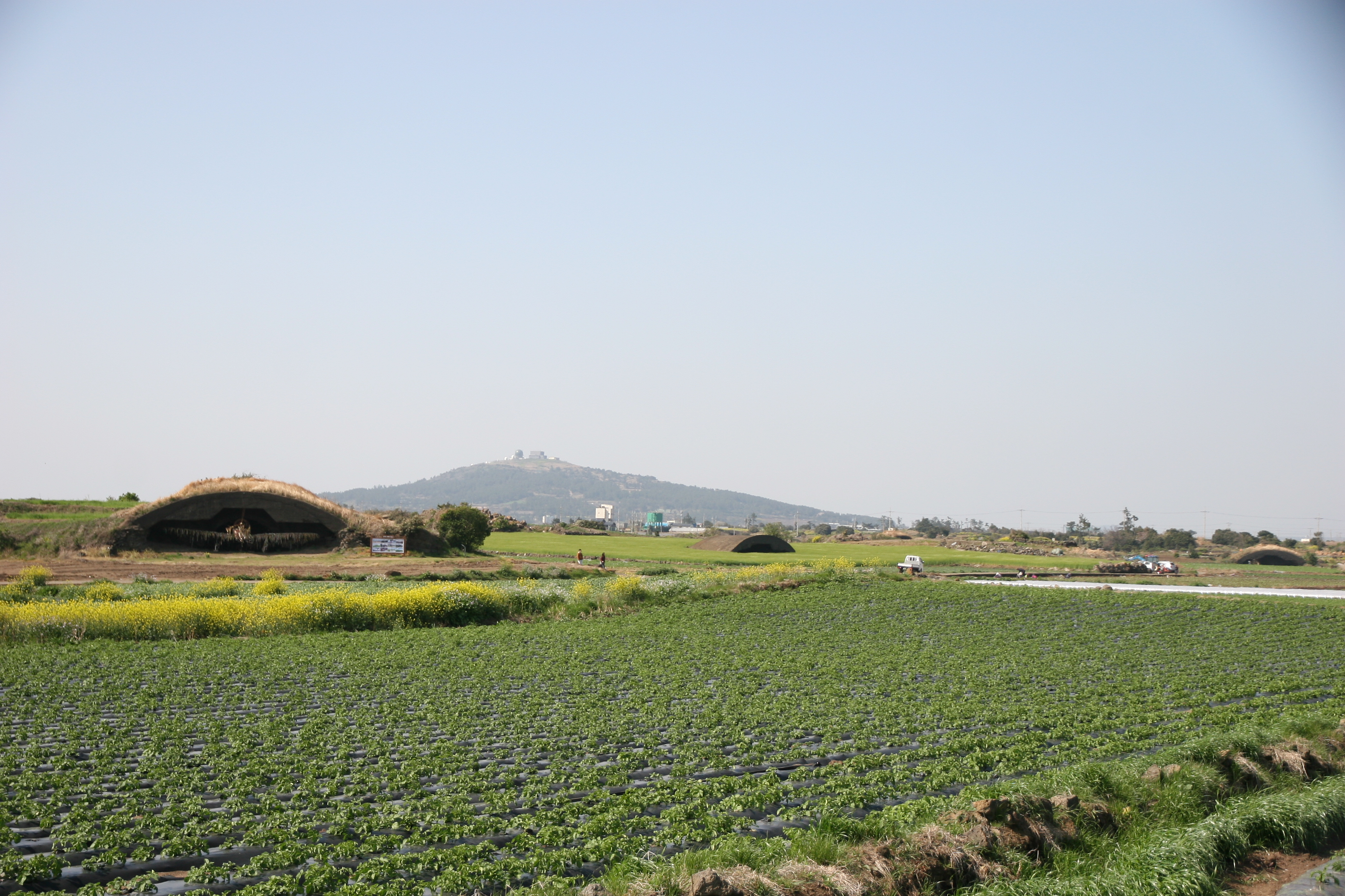 비행장 안쪽으로 바라보면 밭들 사이로 여러 개의 비행기 격납고가 보입니다.