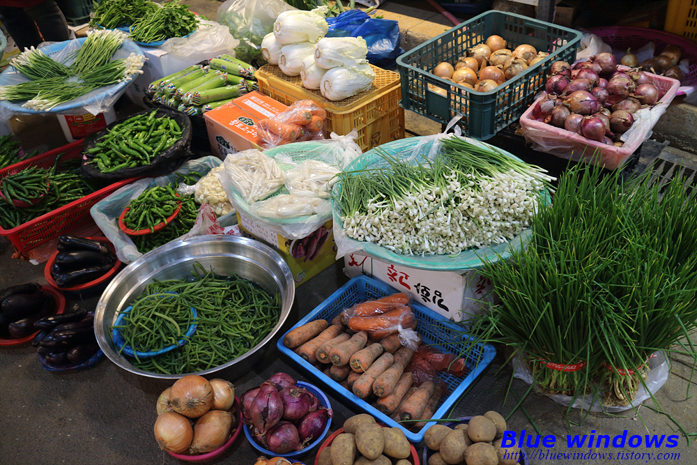 주로 채소나 과일을 많이 팔고 간간히 먹거리 파는 곳도 있습니다.