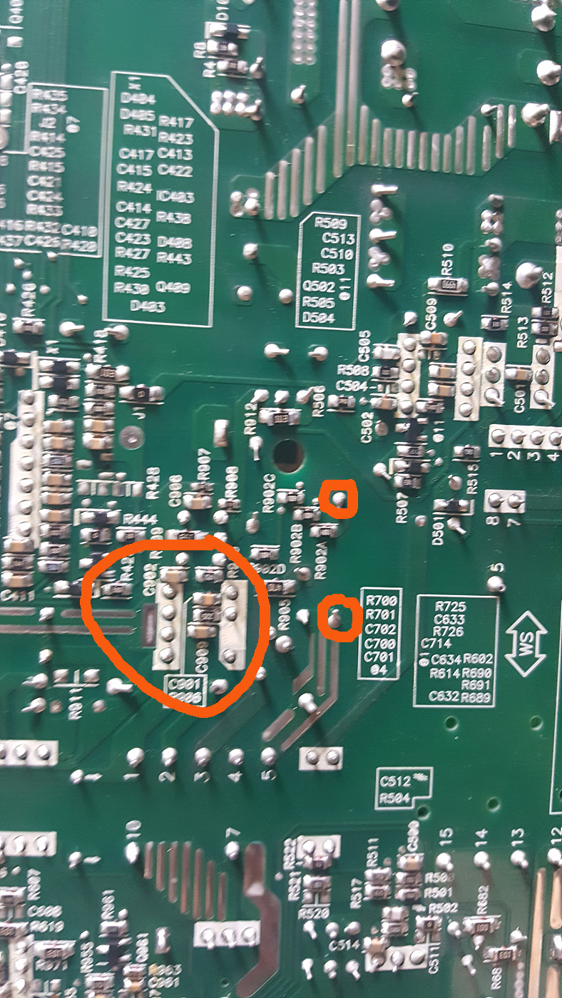 PCB 뒷면인데 붉은 원이 TNY279PN이고 그 옆에 작은 원 두 개가 R901 위치입니다.